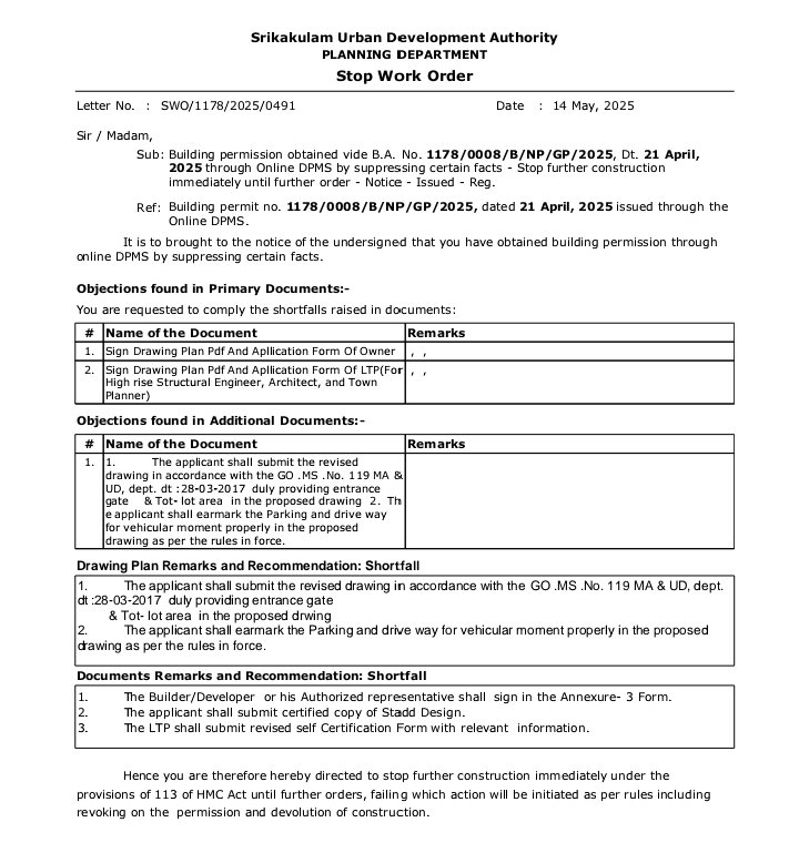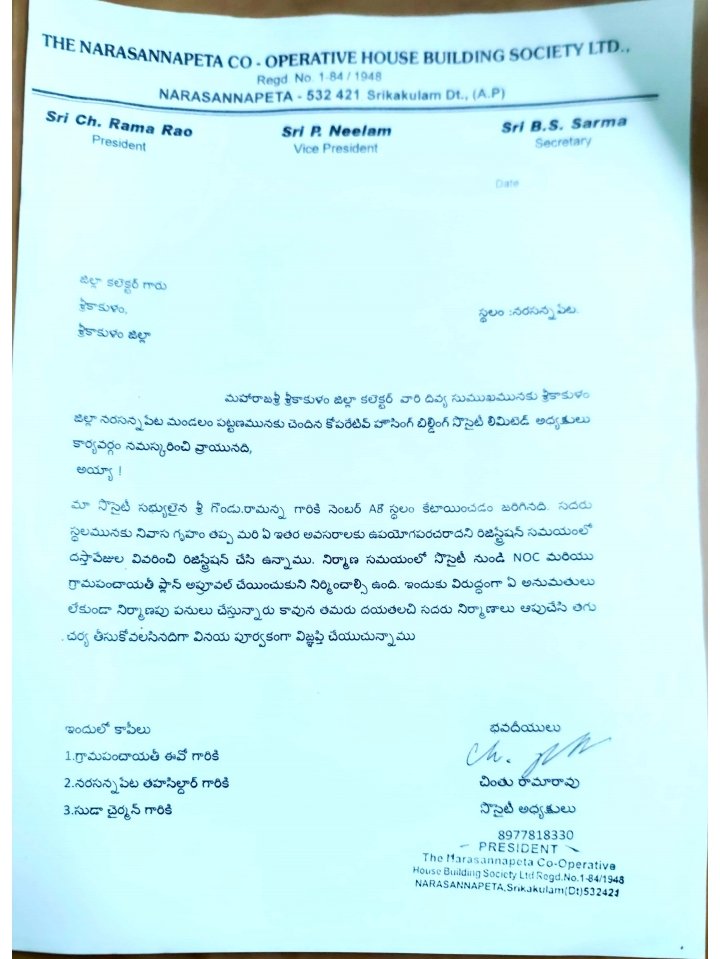 నరసన్నపేట పట్టణంలోని ఇందిరానగర్ ప్రాంతంలో అనుమతి లేకుండా నిర్మిస్తున్న అపార్ట్మెంట్ నిర్మాణం పై నరసన్నపేట పోలీసులకు బిల్డింగ్స్ సొసైటీ అధ్యక్షులు చింతు రామారావు ఫిర్యాదు చేశారు. బిల్డింగ్ సొసైటీ నియమాలకు అతీతంగా నిర్మాణాలు చేపడుతున్నారని, గ్రామపంచాయతీ బిల్డింగ్స్ సొసైటీ ఎన్ఓసి లేకుండా గృహేతర ఉపయోగాలకు నిర్మాణాలకు ఒప్పందం చేసుకోవడం బిల్డింగ్ సొసైటీ నియమాలు ఉల్లంఘిస్తూ చేపడుతున్న పనులను తక్షణమే నిలిపివేయాలని నరసన్నపేట పోలీసులకు ఫిర్యాదు చేశారు.