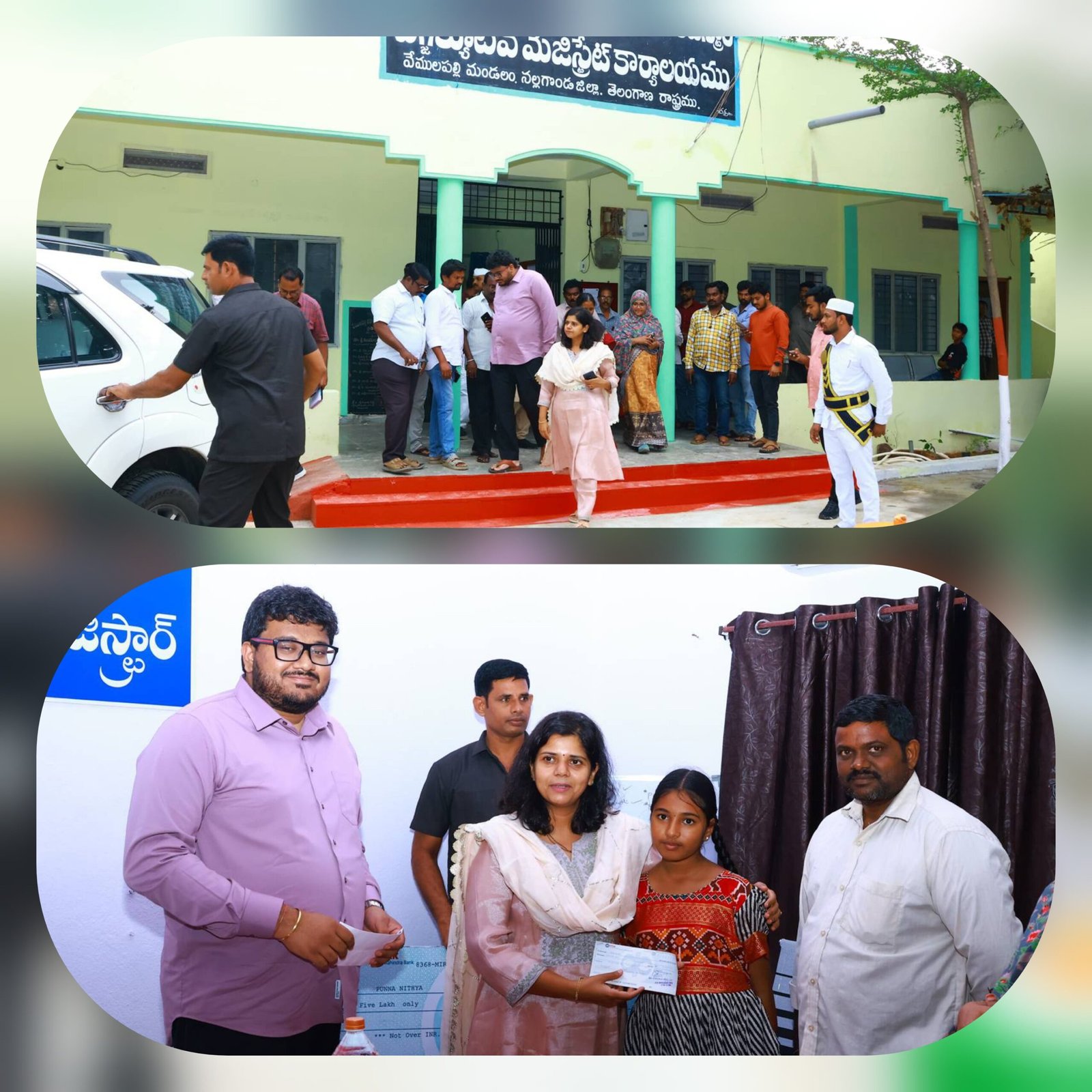 గురువారం ఆమె నల్గొండ జిల్లా వేములపల్లి మండలం కార్యాలయంలో చేపట్టిన ఆధునీకరణ పనుల పరిశీలన నిమిత్తం వేములపల్లికి వచ్చారు. మాడుగుల పల్లి మండలం ఆగామోత్కూర్ కు చెందిన తండ్రి,కొడుకులు పున్న సాంబయ్య, శివమణిలు, గణేష్ నిమజ్జనం సందర్భంగా వేములపల్లి వద్ద ఉన్న కాలువలోకి దిగి ప్రమాదవశాత్తు కాలువలో పడి గల్లంతు కాగా ఇదివరకే తల్లి ని కోల్పోయిన చిన్నారి నిత్య, తండ్రి, సోదరుడిని కూడా కోల్పోవడంతో అనాధగా మిగిలిపోయింది. ఈ విషయం తెలిసిన జిల్లా కలెక్టర్ చిన్నారి నిత్యకు అండగా నిలిచే క్రమంలో భాగంగా వేములపల్లి తహసిల్దార్ కార్యాలయంలో నిత్యకు ఐదు లక్షల రూపాయల చెక్కును అందించి ధైర్యం చెప్పారు. ధైర్యంగా ఉండాలని బాగా చదువుకోవాలని అన్నారు. ఆమె వెంట మిర్యాలగూడ సబ్ కలెక్టర్ నారాయణ అమిత్, వేములపల్లి,మాడుగులపల్లి తహ సిల్దార్లు హేమలత, సరోజ పావని, డిప్యూటీ తహ సిల్దార్ తదితరులు ఉన్నారు.