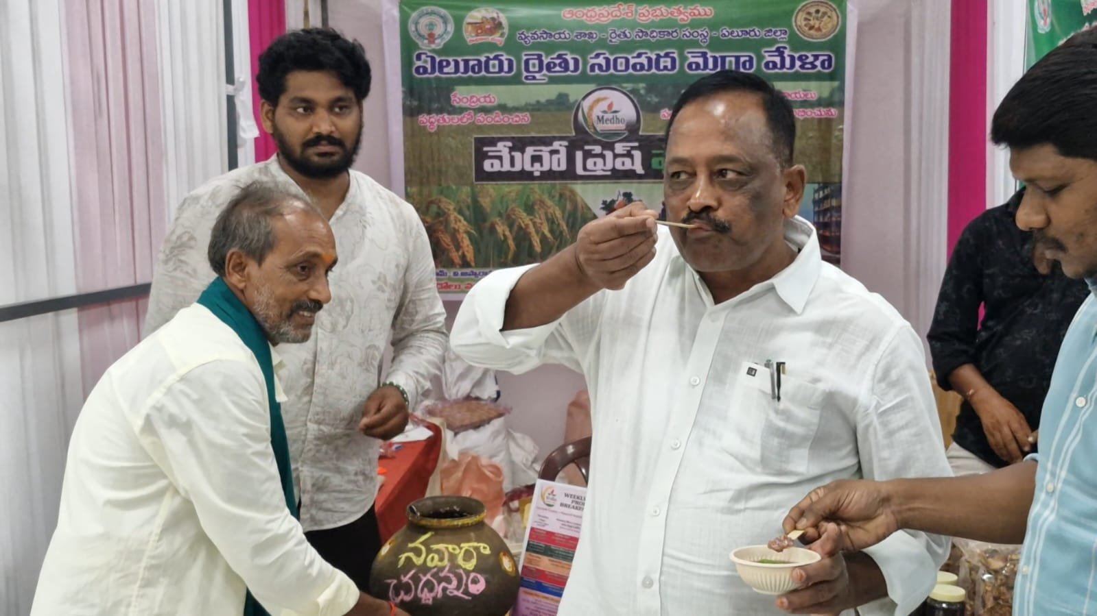 ఏలూరు నందు DCMS ఫంక్షన్ హాల్ లో 18,19 తేదీలలో ఏపీసీఎన్ఎఫ్, ఆర్వైఎస్ఎస్ వారి ఆధ్వర్యంలో నిర్వహించినటువంటి ఆర్గానిక్, నేచురల్ ప్రొడక్ట్స్ ఎగ్జిబిషన్ కం సేల్ కార్యక్రమాన్ని కలెక్టర్ వెట్రి సెల్వి ప్రారంభించినారు. ఇందులో భాగంగా మేధో ఫ్రెష్ ఫామ్ ప్రైవేట్ లిమిటెడ్ ,సూరప్పగూడెం భీమడోలు వారు నిర్వహించిన స్టాల్ నందు సహజ సిద్ధ పద్ధతుల ద్వారా పండించినటువంటి బహురూపీ, కులాకర్, నవారా, కుంకుమసాలి ధాన్యముకు మంచి ఆదరణ లభించింది అలాగే “నవారా చద్దన్నము” స్టాల్ నందు ప్రత్యేక ఆకర్షణగా నిలిచినది. తన తాతల నాటి చద్దన్నమును తన తండ్రి వెజ్జు అప్పారావు ద్వారా తయారీ విధానాన్ని తెలుసుకొని ప్రజలకు రుచి చూపించారు. మేధో ఫ్రెష్ ఫామ్ డైరెక్టర్ అయినటువంటి వీజేవీ రంజిత్ వివిధ రకాల ఆర్గానిక్ రైస్ చద్దన్నము యొక్క ఉపయోగాలను ఏలూరు ప్రజలకు ఈ “ఏలూరు రైతు సంపద వేదిక”గా తెలియజేసినారు. ఈ చద్దన్నము వలన నరాల బలహీనతలు, గట్ హెల్త్ ప్రాబ్లమ్స్, ఎముకల బలహీనత, రక్తహీనత, PCOD, PCOS, మైగ్రేన్, హార్మోన్స్ ఇన్ బాలన్స్ వంటి సమస్యల నుండి దూరమవుటకు ఈ చద్దన్నమును తమ ఆహార అలవాట్లలో చేర్చుకోవాలని తెలియజేసినారు. దీని గురించి సబ్స్క్రిప్షన్ తీసుకొనుటకు 7993374858 నెంబర్ ను సంప్రదించగలరు. ఇలాంటి అవకాశాన్ని రైతులకు అందించినటువంటి కలెక్టర్ కి, ఏలూరు రైతు సంపద వ్యవసాయ అధికారులకు కృతజ్ఞతలు తెలియజేసుకున్నారు.
