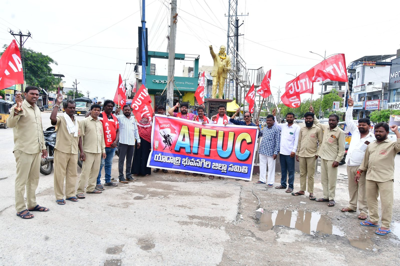 బుధవారం రోజున కేంద్ర ప్రభుత్వ కార్మిక, రైతు వ్యతిరేక విధానాలకు, ప్రభుత్వ రంగ సంస్థల ప్రైవేటీకరణకు వ్యతిరేకంగా జాతీయ కార్మిక సంఘాలు మరియు రైతు సంఘాల పిలుపు మేరకు భువనగిరిలోని భారత రాజ్యాంగ నిర్మాత బి. ఆర్ అంబేద్కర్ విగ్రహం ఎదురుగ ఏఐటీయూసీ ఆధ్వర్యంలో నిరసన ధర్నా నిర్వహించడం జరిగింది. ఈ సందర్బంగా రాములు, ఇమ్రాన్ మాట్లాడుతూ కేంద్ర ప్రభుత్వం కార్మిక, రైతు, ప్రజా వ్యతిరేక విధానాలలో భాగంగా 29 కార్మిక చట్టాలను రద్దు చేసి 4 లేబర్ కోడ్లు తెచ్చి కార్మిక చట్టాలను నిర్వీర్యం చేస్తూ దేశంలో కార్మికులు యూనియన్ పెట్టుకునే హక్కు లేకుండా చేస్తుందని, ప్రభుత్వ రంగ సంస్థలన్నీ ప్రైవేటుపరం చేసి కార్పొరేట్ శక్తులకు, అదాని, అంబానీ లాంటి బడా పెట్టుబడిదారుల ఆస్తులు పెంచి కార్మికులను నిరుపేదలగా మార్చే ప్రయత్నం కేంద్ర ప్రభుత్వం చేస్తుందని వారు ఆరోపించారు. పబ్లిక్ సెక్టార్, ప్రభుత్వ రంగ సంస్థలను కాపాడాలని, రైతు వ్యతిరేక 3 నల్ల చట్టాలను మరియు 4 లేబర్ కోడ్ లను రద్దు చేయాలని డిమాండ్ చేశారు. కనీస వేతనం ప్రతి కార్మికునికి 26 వేలు మరియు కనీస పెన్షన్ నెలకు రూ 5 వేలు ఇవ్వాలని, స్కీమ్ వర్కర్ లను క్రమబద్ధీకరించి ఉద్యోగ భద్రత కల్పించాలనీ, కాంట్రాక్ట్ ఔట్సోర్సింగ్ కార్మికులను వెంటనే పర్మినెంట్ చేయాలని, మధ్యాహ్న భోజన వంట కార్మికులకు ప్రభుత్వమే వంట గ్యాస్ మరియి నిత్యవసర వస్తువులు సరఫరా చేయాలని, అసంఘటితరంగా కార్మికులకు సంక్షేమ బోర్డు ఏర్పాటు చేయాలని డిమాండ్ చేశారు.
