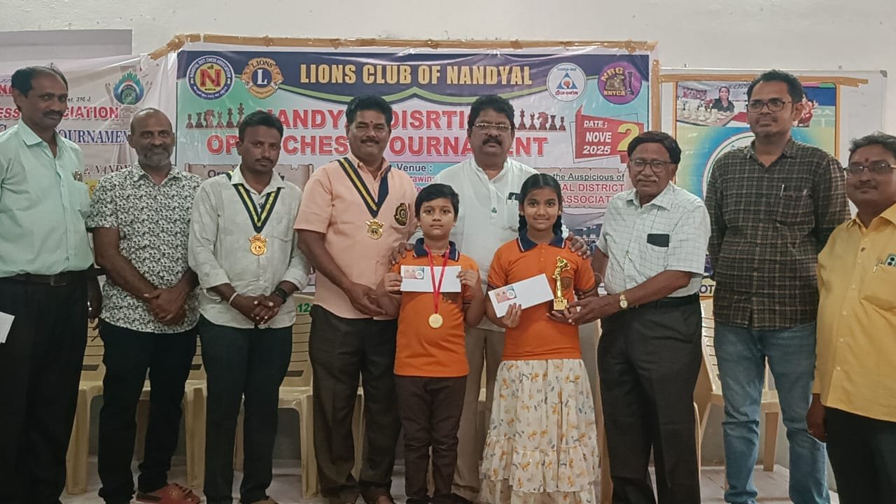 నంద్యాల జిల్లా చెస్ సంఘం, నంద్యాల లయన్స్ క్లబ్ సంయుక్త నిర్వహణలో ఈపూరి శేషయ్య శెట్టి ప్రభుత్వ పాలిటెక్నిక్ కళాశాల జింకా ఆడిటోరియంలో జరిగిన జిల్లా స్థాయి ఓపెన్ చదరంగం పోటీలలో విజేతలకు నంద్యాల లయన్స్ క్లబ్ వ్యవస్థాపక సభ్యులు, పారిశ్రామికవేత్త ఆత్మకూరు సుదర్శనం శెట్టి సౌజన్యంతో పతకాలు, ట్రోఫీలు, నగదు బహుమతులు అందజేయడం జరిగింది నంద్యాల జిల్లా చెస్ సంఘం ప్రధాన కార్యదర్శి రామసుబ్బారెడ్డి నిర్వహించిన బహుమతి ప్రధానోత్సవం లో నంద్యాల జిల్లా చెస్ సంఘం అధ్యక్షులు డాక్టర్ రవి కృష్ణ, ప్రముఖ వైద్యులు డాక్టర్ గెలివి సహదేవుడు, నంద్యాల లయన్స్ క్లబ్ అధ్యక్షులు సోమేసుల నాగరాజు కోశాధికారి అమిదేల జనార్ధన్ అతిథులుగా పాల్గొని మొదటి పది స్థానాలు సాధించిన వారికి ట్రోఫీలు,నగదు బహుమతులు,వివిధ వయసు కేటగిరీలలో విజేతలకు పతకాలు అందజేశారు ఈ సందర్భంగా డాక్టర్ రవి కృష్ణ, డాక్టర్ సహదేవుడు మాట్లాడుతూ గెలిచినవారు తమ గెలుపు స్థానాన్ని నిలబెట్టుకోవడానికి,విజయం అందుకోని వారు తదుపరి పోటీలలో విజయాలు సాధించడానికి కోచ్ ల పర్యవేక్షణలో నిత్య సాధన ద్వారా క్రీడలలో ఉన్నత స్థాయికి చేరుకోవచ్చని అన్నారు. ఆ విధమైన అంకితభావం,క్రమశిక్షణ క్రీడాకారులకు చాలా అవసరం అన్నారు ఈ కార్యక్రమంలో చెస్ జిల్లా సంఘం ప్రధాన కార్యదర్శి రామసుబ్బారెడ్డి, లయన్స్ క్లబ్ సభ్యులు మేడం చంద్రశేఖర్,టోర్నమెంట్ పర్యవేక్షకులు వెంకటరావు, గెలివి శ్రీకాంత్, సత్య సాయి పబ్లిక్ స్కూల్ కరస్పాండెంట్ మణికంఠ,నేషనల్ ఆర్బిటర్ సుజాత,వ్యాయామ ఉపాధ్యాయులు మాలిక్ భాషా, జస్ట్ కోచ్ శ్రీనివాసులు బహుమతి ప్రధానోత్సవం లో పాల్గొన్నారు నంద్యాల జిల్లా చదరంగం పోటీ విజేతలు: ఇమామ్ హుసేని ప్రధమ స్థానం,యుగంధర్ ద్వితీయ స్థానం, రిషితా బాయ్ తృతీయ స్థానం సాధించగా, తదుపరి ఆరు స్థానాలు మన్విత్ నాయక్,జానకి రామ రాజు,మోక్షిత్ కుమార్,సాయి కార్తికేయ,శాలెం మణికుమార్,లక్ష్మీ సందీప్,హార్జిత్ వర్మ సాధించి ట్రోఫీలు నగదు బహుమతులు అందుకున్నారు.