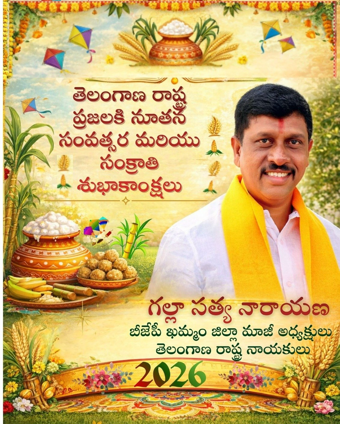 తెలంగాణ రాష్ట్ర ప్రజలకి బీజేపీ శ్రేణులకి భోగి, సంక్రాతి, కనుమ పండుగ శుభాకాంక్షలు.. మీ గల్లా సత్య నారాయణ. బీజేపీ తెలంగాణ రాష్ట్ర నాయకులు. ఖమ్మం.