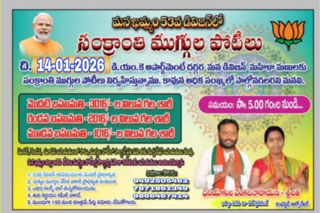 ఖమ్మం నగరంలోని 53వ డివిజన్లో ఖమ్మం బీజేపీ టూ టౌన్ అధ్యక్షులు ధనియాకుల వెంకటనారాయణ శ్రీమతి శ్రీ లత ఆధ్వర్యంలో సంక్రాంతి ముగ్గుల పోటీల కార్యక్రమం నిర్వహించనున్నట్లు తెలిపారు. సంక్రాంతి పండుగను పురస్కరించుకుని మహిళలు, స్థానికులు ఉత్సాహంగా పాల్గొనేలా ఈ కార్యక్రమాన్ని ఏర్పాటు చేసినట్లు పేర్కొన్నారు.