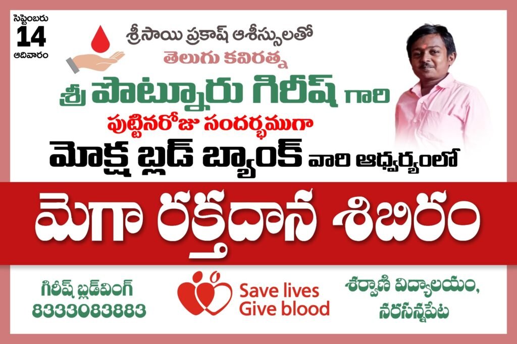 సాధారణంగా పుట్టినరోజు అంటే కేక్ కట్చేసి, కొవ్వొత్తులు ఆర్పి, పూలతో శుభాకాంక్షలు అందుకోవడమే. కానీ తెలుగు కవిరత్న పొట్నూరు గిరీష్ గారి ఆలోచన మాత్రం భిన్నం. ఆయనకు పుట్టినరోజు అంటే సేవకు సంకేతం, మానవత్వానికి ముద్ర, రక్తపు చుక్కతో ప్రాణపు దీపం వెలిగించడం. సేవను వేడుకగా మార్చిన కవి 13 సెప్టెంబర్ 2025న గిరీష్ గారి పుట్టినరోజు. ఈ పుట్టినరోజును ఆయన వ్యక్తిగత ఆనందంగా కాకుండా, సమాజానికి ఉపయోగపడే మహోత్సవంగా మార్చుకున్నారు. “జన్మదినం అనేది ఒక్కరి పుట్టుకకే కాదు, మరొకరి ప్రాణానికి పునర్జన్మ ఇవ్వగల రోజు” అనే నమ్మకంతో ఆయన ముందుకొచ్చారు. మోక్ష బ్లడ్ బ్యాంక్ ఆధ్వర్యంలోఈ స్ఫూర్తిదాయక ఆలోచనతో 14 సెప్టెంబర్ 2025 (ఆదివారం) న నరసన్నపేటలోని శర్వాణి విద్యాలయం వేదికగా మెగా రక్తదాన శిబిరం జరుగనుంది. ఈ కార్యక్రమాన్ని మోక్ష బ్లడ్ బ్యాంక్ ఆధ్వర్యంలో నిర్వహిస్తున్నారు. శతాధిక రక్తదాతలు పాల్గొనబోతున్నారు. రక్తదానం – రక్తస్నానం కాదు, రక్షణ. రక్తదానం చేయడం అంటే మనం ఏదైనా కోల్పోవడం కాదు; ఒకరి ప్రాణాన్ని కాపాడడం. మన శరీరంలో తిరిగి పునరుత్పత్తి అయ్యే చుక్కలతో, మరొకరి ప్రాణం నిలబెట్టడం కన్నా గొప్ప దానం మరొకటి లేదు. ఇదే “రక్తదానం మహాదానం” అన్న తాత్పర్యం.