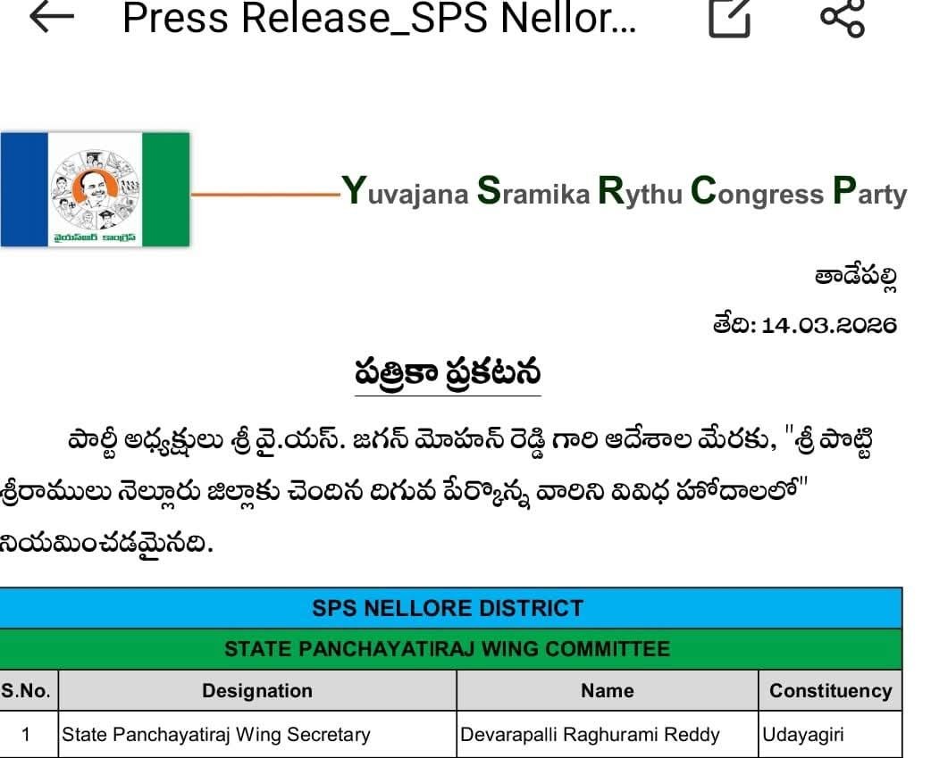 ఉదయగిరి నియోజకవర్గం జలదంకి మండలం బ్రాహ్మణకాక అగ్రహారానికి చెందిన దేవరపల్లి రఘురాం రెడ్డి గారు వైఎస్ఆర్ కాంగ్రెస్ పార్టీ పంచాయతీరాజ్ విభాగంలో రాష్ట్ర సెక్రటరీగా నియమితులయ్యారు.