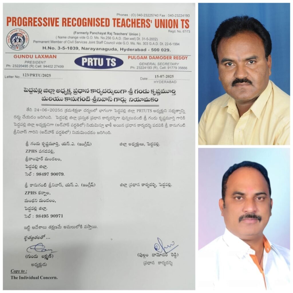 పెద్దపల్లి, జులై 15, పున్నమి ప్రతినిధి: పెద్దపల్లి జిల్లా నూతన పి.ఆర్.టి.యు.టి.ఎస్ అధ్యక్షుడుగా గండు కృష్ణ మూర్తి, ప్రధాన కార్యదర్శిగా కానుగంటి శ్రీనివాస్ ను ఎంపిక చేస్తూ రాష్ట్ర అధ్యక్షుడు గుండు లక్ష్మణ్, ప్రధాన కార్యదర్శి పులగం దామోదర రెడ్డి లు ఉత్తర్వులు జారీ చేశారు. గతంలో జిల్లా ఆవిర్భావం తర్వాత కూడా జిల్లా ప్రధాన కార్యదర్శిగా పని చేసిన కానుగంటి శ్రీనివాస్ ను తిరిగి ఆ పదవి కోసం ఎంపిక చేసి, అధ్యక్షుడుగా గండు కృష్ణ మూర్తిని నియామకం చేసినందుకు పి.ఆర్.టి.యు ఉపాధ్యాయ ఎమ్మెల్సీ పింగళి శ్రీపాల్ రెడ్డికి, కరీంనగర్ ఉపాధ్యాయ ఎమ్మెల్సీ అభ్యర్థి వంగ మహేందర్ రెడ్డికి, రాష్ట్ర అధ్యక్షుడు, ప్రధాన కార్యదర్శికి, వివిధ మండల శాఖల అధ్యక్షులు ప్రధాన కార్యదర్శిలకు, జిల్లా, రాష్ట్ర బాధ్యులు, సీనియర్ నాయకులకు, కార్యకర్తలకు కృతజ్ఞతలు తెలియజేశారు.