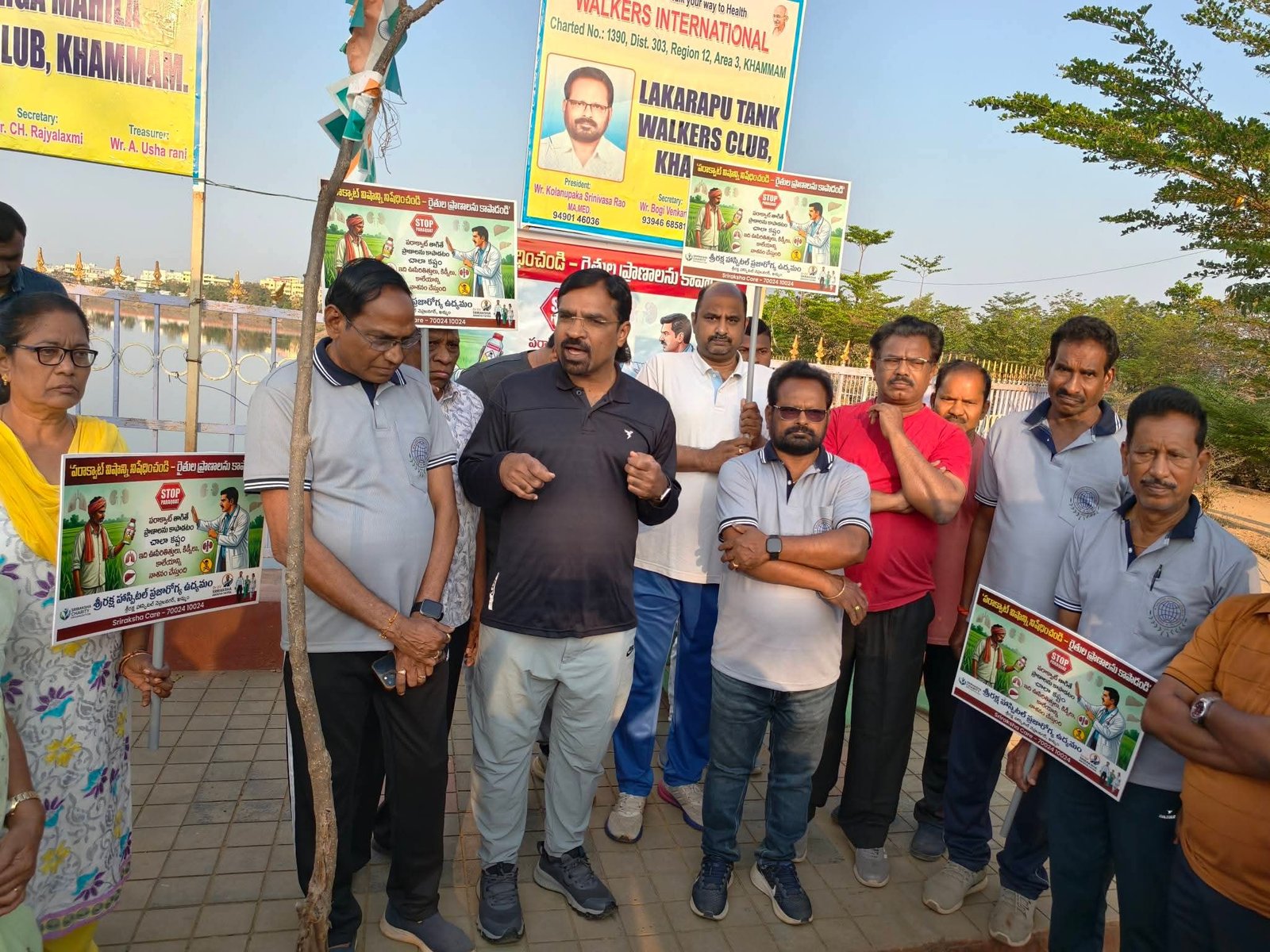 రైతుల ప్రాణాలను కాపాడటానికి ప్రాణాంతకమైన పరాక్వాట్ విషాన్ని వెంటనే నిషేధించాలని డిమాండ్ చేస్తూ ఖమ్మం నగరంలోని లకారం ట్యాంక్ బండ్ వద్ద గురువారం ప్రజా అవగాహన నిరసన కార్యక్రమం నిర్వహించారు. ఈ కార్యక్రమాన్ని శ్రీ రక్ష హాస్పిటల్ ఆధ్వర్యంలో ఏర్పాటు చేశారు.