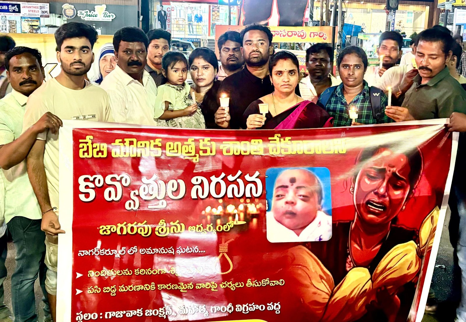 నాగర్‌కర్నూల్ జిల్లా కుమ్మెర గ్రామంలో మల్లన్న జాతర సందర్భంగా చోటుచేసుకున్న దారుణ ఘటన రాష్ట్రవ్యాప్తంగా తీవ్ర ఆందోళనకు దారితీసింది.కులవివక్ష నేపథ్యంలో నిరుపేద రజక కుటుంబంపై జరిగిన దాడిలో రెండు నెలల పసిపాప మృతి చెందడం మానవత్వానికే మచ్చగా నిలిచింది.కుమ్మెర గ్రామానికి చెందిన గణేశ్,ఆయన భార్య మౌనిక తమ రెండు నెలల పసిపాపతో కలిసి జాతరకు హాజరయ్యారు.ఈ సందర్భంగా జరిగిన వాగ్వాదం కులవివక్ష రూపం దాల్చి,కొంతమంది వ్యక్తులు కుటుంబంపై దాడికి పాల్పడినట్లు స్థానికులు తెలిపారు.ఈ దాడిలో పసిపాప తీవ్రంగా గాయపడగా,ఆసుపత్రికి తరలించేలోపే ప్రాణాలు కోల్పోయింది.ఈ ఘటనపై గాజువాక బీసీ సంఘం అధ్యక్షులు జాగరపు శ్రీను తీవ్రంగా స్పందిస్తూ నిందితులను కఠినంగా శిక్షించాలని,పసిబిడ్డ మరణానికి కారణమైన వారిపై తక్షణ చర్యలు తీసుకోవాలని డిమాండ్ చేశారు.బీసీ సమాజంపై జరుగుతున్న దాడులు రోజురోజుకూ పెరుగుతున్నాయని,ప్రభుత్వం ప్రత్యేక దృష్టి సారించి కఠిన చర్యలు చేపట్టాలని కోరారు.బేబీ మౌనిక ఆత్మశాంతి కోసం గాజువాక గాంధీ సెంటర్‌లో జాగరపు శ్రీను ఆధ్వర్యంలో కొవ్వొత్తుల నిరసన కార్యక్రమం నిర్వహించారు.ఈ కార్యక్రమంలో అండిబోయిన అప్పారావు,తోకాడ రాము,బచ్చ త్రిమూర్తులు,జాగరపు హరిత,పూర్ణిమ,సుదమల్ల ఈశ్వరరావు,నవీన్,రాజు తదితరులు పాల్గొని సంఘీభావం తెలిపారు.78 సంవత్సరాల స్వతంత్ర భారతదేశంలో ఇలాంటి కులహంకారపు దుశ్చర్యలు జరగడం దురదృష్టకరమని పలువురు ఆవేదన వ్యక్తం చేశారు.ఇలాంటి ఘటనలు పునరావృతం కాకుండా ప్రభుత్వం కఠిన చర్యలు తీసుకోవాలని వారు కోరారు.