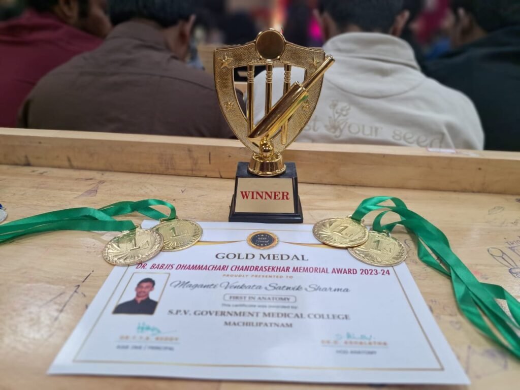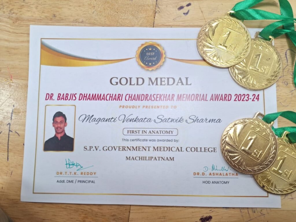 మచిలీపట్నం, జూలై 26:ఎస్.పి.వి. గవర్నమెంట్ మెడికల్ కాలేజ్, మచిలీపట్నం లో అనాటమీ (Anatomy) విభాగంలో ఉత్తమ ప్రతిభ కనబరిచిన మోగంటి వెంకట సాత్విక్ శర్మ గారు బంగారు పతకం (Gold Medal) సాధించారు. విద్యార్ధి ఈ విజయాన్ని తన కృషితో సాధించగా, ఈ గౌరవం కలకాలం గుర్తుండిపోయేలా చేసింది.వెంకట సాత్విక్ శర్మ తల్లిదండ్రులు శ్రీ మోగంటి వెంకట కామేశ్వర రావు గారు మరియు శ్రీమతి శైలజ గారు తన కుమారుని విజయాన్ని చూసి ఆనందానికి అవధులు లేకుండా హర్షం వ్యక్తం చేశారు. విద్యార్థికి ఆశీర్వాదాలు తెలిపిన తన పెద్దనాన్న పెద్దమ్మ ఎంవి జనార్దనరావు, లక్ష్మీ అతని భవిష్యత్తు మరింత ఉజ్వలంగా ఉండాలని ఆకాంక్షించారు.ఇది కళాశాలకి గర్వకారణంగా మారింది. అంతే కాదు, ఇతర విద్యార్థులకు ప్రేరణగా నిలిచింది.