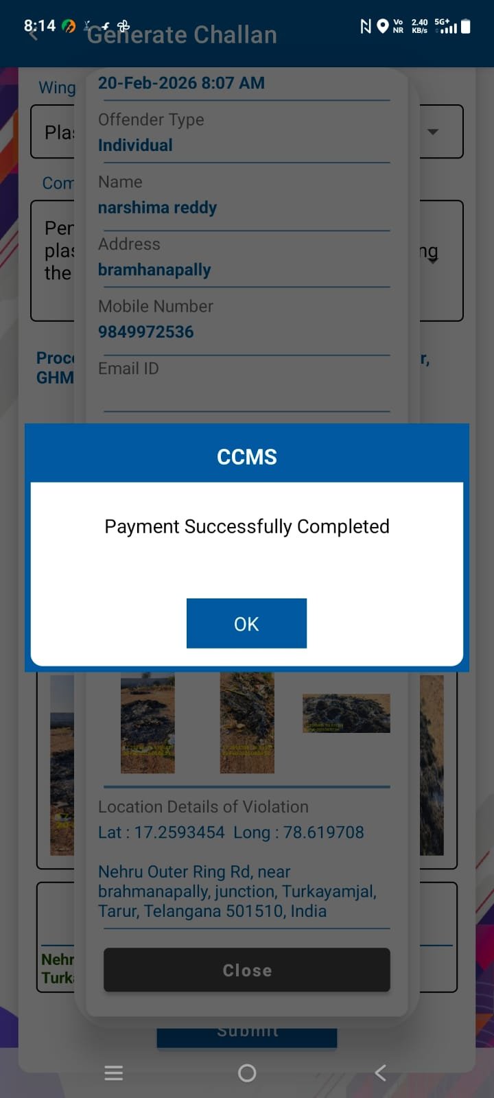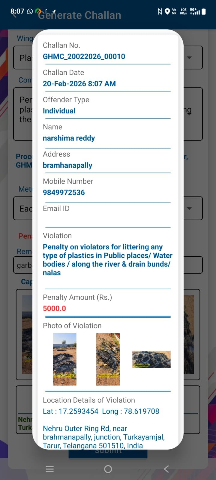 బ్రాహ్మణపల్లి ఓఆర్ సర్వీస్ రోడ్ పక్కన గల ది లాస్ట్ రేట్ యాజమాన్యం గురువారం సాయంత్రం భారీ ఎత్తున ప్లాస్టిక్ నిలువలు కాల్చినట్లు సమాచారం అందుకున్న సంబంధిత అధికారులు శుక్రవారం ఉదయం హాల్ ప్రాంతానికి చేరుకొని ది లష్ రిట్రీట్ యాజమాన్యానికి 5000 జరిమానా వేధించారు. బై సంఘంగా చెత్త కాల్చడం నిషేధం లో ఉన్నట్లు దీన్ని ఎవరు ఉల్లంఘించిన ఉపేక్షించేది లేదని శానిటేషన్ ఇన్స్పెక్టర్ వనిత అన్నారు. ప్రభుత్వానికి అధికారులకు ప్రజలు సహకరించాలని చట్టాల్ని గౌరవించాలని ఈ సందర్భంగా తెలిపారు. జిహెచ్ఎంసి అధికారులు సిబ్బంది తదితరులు పాల్గొన్నారు.