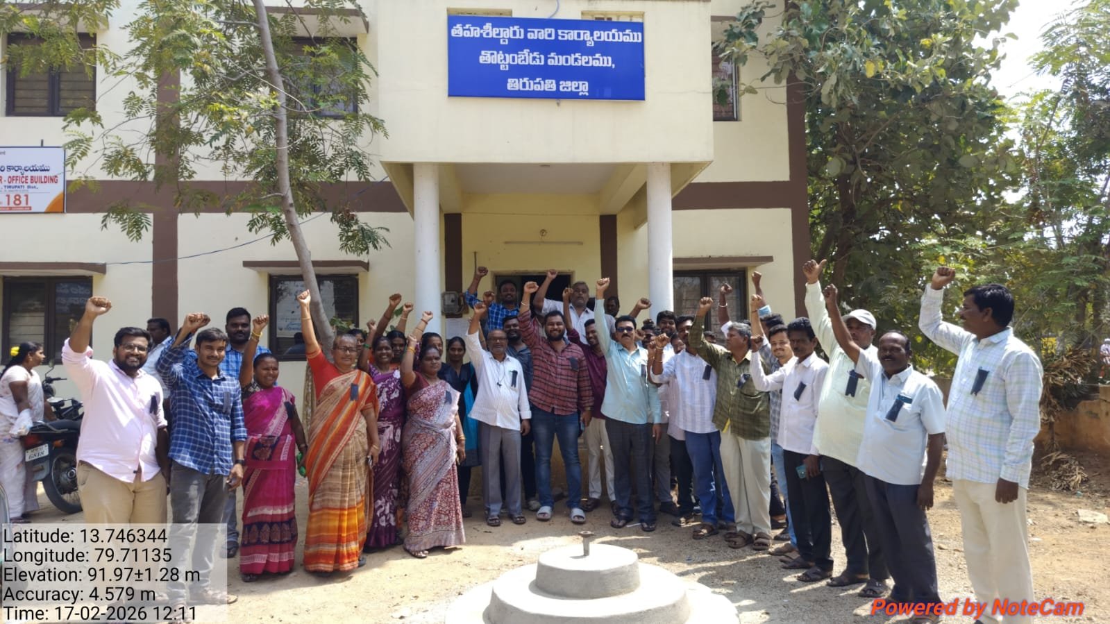 తొట్టంబేడు, పున్నమి న్యూస్, ఫిబ్రవరి 17: తొట్టంబేడు మండల రెవెన్యూ యంత్రాంగం నిరసన బాట పట్టింది. ఆంధ్రప్రదేశ్ రెవెన్యూ ఉద్యోగుల ఉమ్మడి కార్యాచరణ కమిటీ (Revenue JAC) రాష్ట్రవ్యాప్త పిలుపుతో తమ న్యాయమైన డిమాండ్లను పరిష్కరించాలని కోరుతూ మండల తహసీల్దార్ కార్యాలయం ఎదుట ఉద్యోగులు నల్ల బ్యాడ్జీలు ధరించి నిరసన చేపట్టారు. ఈ నిరసన కార్యక్రమంలో మండల ఉప తహసీల్దారు, మండల సర్వేయర్, రెవెన్యూ ఇన్ స్పెక్టర్ల ప్రత్యక్ష పర్యవేక్షణలో ఉత్సాహంగా సాగింది. మండల పరిధిలోని గ్రామ రెవెన్యూ అధికారులు, గ్రామ సచివాలయ సర్వేయర్లు, గ్రామ రెవెన్యూ సహాయకులు అందరూ ఏకతాటిపైకి వచ్చి ప్రభుత్వానికి తమ నిరసనను తెలియజేశారు.