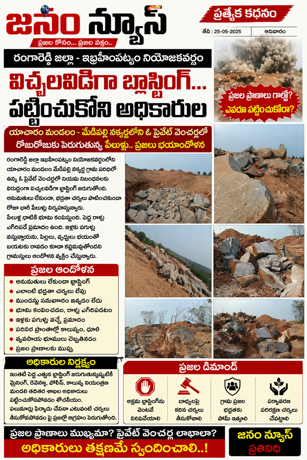 రంగారెడ్డి జిల్లా ఇబ్రహీంపట్నం నియోజకవర్గంలోని యాచారం మండలం మేడిపల్లి నక్కర్త గ్రామ పరిధిలో ఉన్న కొన్ని ప్రైవేట్ వెంచర్లలో నిబంధనలు పూర్తిగా ఉల్లంఘిస్తూ విచ్చలవిడిగా రాళ్ల బ్లాస్టింగ్ జరుగుతున్న ఘటన తీవ్ర ఆందోళనకు గురి చేస్తోంది.