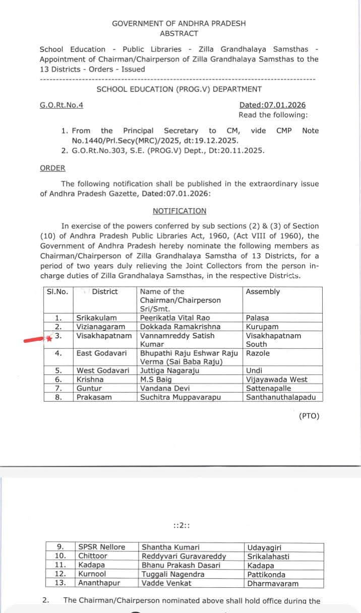 విశాఖపట్నం జిల్లా గ్రంథాలయ సంస్థ చైర్మన్గా వన్నెంరెడ్డి సతీష్ కుమార్ను రాష్ట్ర ప్రభుత్వం నియమించింది. ఈ మేరకు బుధవారం ప్రభుత్వ ఉత్తర్వులు (G.O) జారీ అయ్యాయి. ఈ సందర్భంగా వన్నెంరెడ్డి సతీష్ కుమార్ మాట్లాడుతూ, తనపై విశ్వాసం ఉంచి ఈ బాధ్యతాయుతమైన పదవిని అప్పగించిన ముఖ్యమంత్రి నారా చంద్రబాబు నాయుడు కి, ఉప ముఖ్యమంత్రి పవన్ కల్యాణ్ కు హృదయపూర్వక కృతజ్ఞతలు తెలిపారు. జిల్లా గ్రంథాలయ సంస్థను మరింత అభివృద్ధి చేసి, విద్యార్థులు, యువత, సాధారణ పాఠకులకు మెరుగైన సేవలు అందించే దిశగా కృషి చేస్తానని ఆయన పేర్కొన్నారు. విశాఖపట్నం జిల్లా పరిధిలో గ్రంథాలయాలను ఆధునికీకరణ చేయడంతో పాటు చదువు సంస్కృతిని ప్రోత్సహించడమే తన ప్రధాన లక్ష్యమని చైర్మన్ వన్నెంరెడ్డి సతీష్ కుమార్ తెలిపారు.