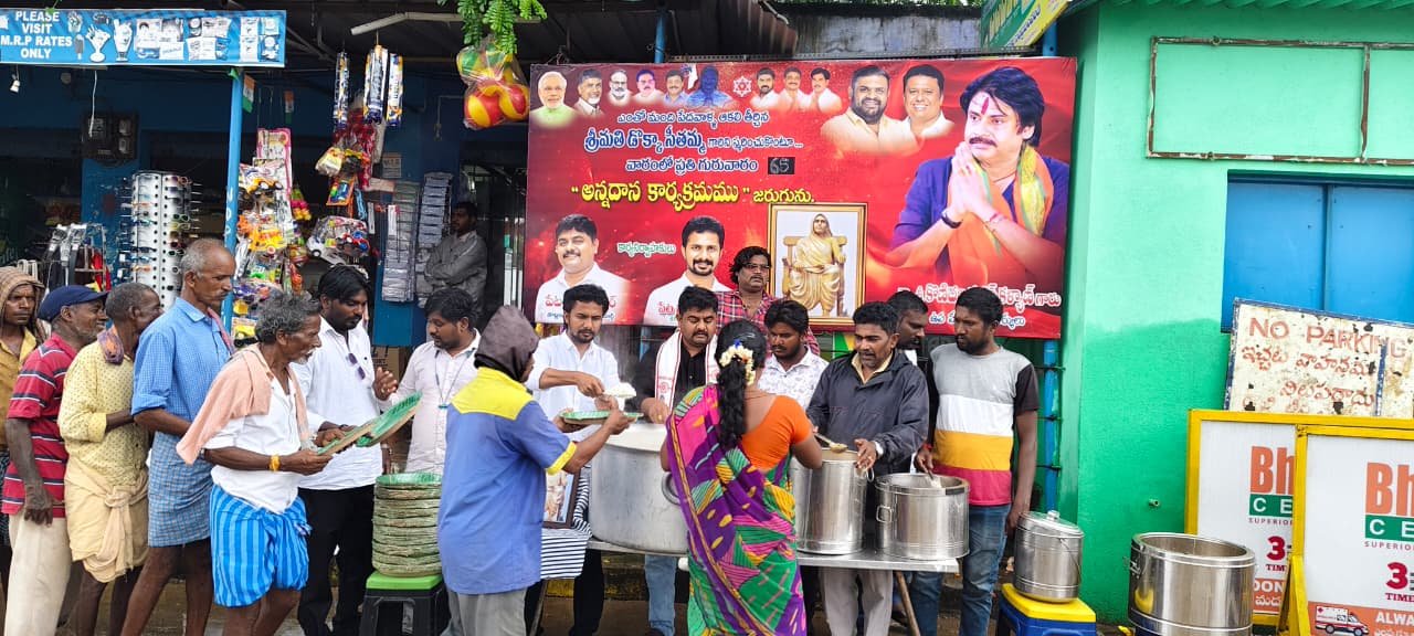 పవన్ కళ్యాణ్ ఆశయంలో భాగంగా శ్రీకాళహస్తిలో ఆర్టీసీ బస్టాండ్ సర్కిల్ నందు పేట బ్రదర్స్ ఆధ్వర్యంలో 65 వ వారం శ్రీమతి డొక్కా సీతమ్మ అన్నదాన కార్యక్రమమును పవన్ కళ్యాణ్ ఆశయాల కృషి కోసం పనిచేసే జనసేన నాయకులు నిర్వహించడం జరిగింది.ఈ కార్యక్రమంలో డొక్కా సీతమ్మ అన్నదాన కార్యక్రమం నిర్వాహకులు పేట చంద్రశేఖర్,పేట చిరంజీవి,ప్రదీప్ కుమార్, తేజ,మనీ,మహేష్,నవీన్,చందు,ముని చంద్ర,రాజా, చందు,వీర మహిళలు బత్తెమ్మ, పద్మ,తదితరులు పాల్గొన్నారు.