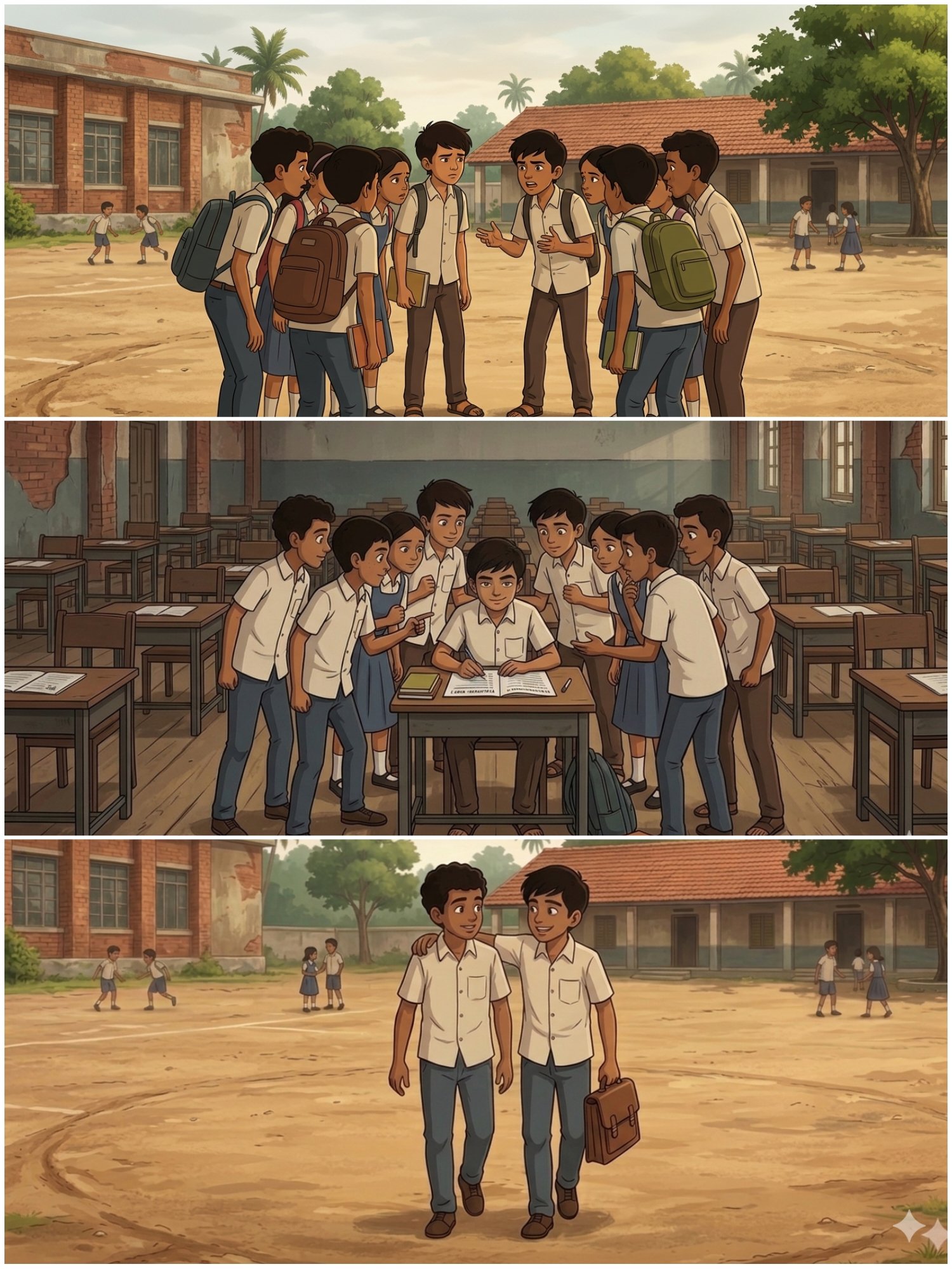అనగనగా ఒక ఊరు ఉంది. ఆ ఊరి పేరు నేస్తాపురం. ఆ ఊరిలో ఈ ఇద్దరు స్నేహితులు ఉన్నారు వారి పేర్లు అశోక్, అర్జున్. మీరిద్దరూ చిన్నప్పటినుండి మంచి స్నేహితులు కానీ అశోక్ కి అర్జున్ అంటే ఏదో తెలియని అసూయ ఉండేది కానీ దాన్ని ఎన్నడూ ఎవరి ముందర వ్యక్తపరచలేదు. అసూయ అనేది అశోక్ ఎప్పుడు బాగా చదివి మార్కులు సంపాదిస్తాడు అప్పుడు వస్తుంది. అర్జున్ అశోక్ చాలా మంచి మిత్రులు. వారి మధ్య ఎన్నడూ వైర్యం అనేది రాలేదు. అశోక్ కి అర్జున్ తో పాటు ఇంకా కొంత మంది మిత్రులు ఉన్నారు అర్జున్ కి కూడా కొంతమంది స్నేహితులు ఉన్నారు. అశోక్ కి స్నేహితులైన వారందరూ అర్జున్ కి స్నేహితులు కానీ అర్జున్ కి స్నేహితులైన వారు అశోక్ కి నచ్చేవారు కాదు అశోక్ స్నేహితులకు కూడా వారు నచ్చేవారు కాదు కానీ అర్జున్ స్నేహితులని ఎప్పుడు చిన్నచూపు చూడలేదు. అశోక్ స్నేహితులందరికీ అర్జున్ బాగా ఉండేవాడు. అర్జున్ పట్ల అశోక్ ఉన్న అసూయని అంతటిని ఒకరోజు అశోక్ తన మిత్రులకి చెప్పాడు. వాళ్ళు ఎందుకు అని ప్రశ్నిస్తే అశోక్ అర్జున్ మీద వాళ్ళకి అబద్దాలు చెప్పాడు. అది విన్న వాళ్లంతా అశోక్ ని తిట్టి నీలాంటి వాడితో మేము స్నేహం చేయము మనిషి ముందు ఒకలా మనిషి వెళ్ళిన తర్వాత ఒకలా మాట్లాడే మనస్తత్వం నీది నీతో మాకు స్నేహం ఇంతటితో తెగిపోయింది అని కఠినంగా వాళ్ళు వెళ్ళిపోయారు. తర్వాత కాసేపటికి అర్జున్ అక్కడికి వచ్చి ఏమైంది అశోక్ మన మిత్రులు అందరూ ఎక్కడికి వెళ్లారు అని అడిగాడు. మళ్లీ ఏదో పని ఉందని అబద్ధం చెప్పి నీతో మాట్లాడటం ఇష్టం లేక వెళ్ళిపోయారు లే నువ్వంటే వాళ్ళకి ఇష్టం లేదని నువ్వు నన్ను మోసం చేస్తున్నావు అని చెప్పారు. నేను దానికి మీరు ఎవరు నాకు అవసరం లేదు నాకు అర్జున్ మాత్రమే స్నేహితుడు మీరు నిజమైన వాళ్ళు కాదు నాకు నా మిత్రుడు మీద అబద్ధాలు చెప్పి నన్ను నా మిత్రుడిని విడదీయాలని అనుకుంటున్నారా అని నేనే వాళ్ళని తిట్టి పంపించాను అని అశోక్ అర్జున్ కి అబద్దం చెప్పాడు. దానికి అర్జున్ అశోక్ తో మన మిత్రులే కదా వదిలే. అయినా మన వాళ్ళని మనం తిట్టకూడదు సరే వాళ్ళ గురించి వదిలే మనకి ఇంకా కొన్ని రోజుల్లో పరీక్షలు ఉన్నాయి కదా వెళ్లి చదువుదాం పద అని అర్జున్ అశోక్ ని తీసుకొని వెళ్ళిపోయాడు. పరీక్షలు రానే వచ్చాయి ఎప్పుడు అశోక్ మొదటి స్థానం లభించేది కానీ ఈసారి అర్జున్ కి మొదటి స్థానం వచ్చింది ఉపాధ్యాయులందరూ అర్జున్ ని పొగిడారు అశోక్ స్నేహితులు అర్జున్ దగ్గరికి వచ్చి కంగ్రాట్స్ చెప్పారు. అశోక్ తో జాగ్రత్తా ఉండమని హెచ్చరించి వెళ్లిపోయారు. అర్జున్ దానిని పట్టించుకోలేదు వారి మాటలను పెడచెవిన పెట్టాడు. ఉపాధ్యాయుడు ఒకరోజు అందరి ముందు అర్జున్ ని తరగతి గది పర్యవేక్షకుడిగా నియమించాడు అది చూసి అశోక్ తట్టుకోలేక