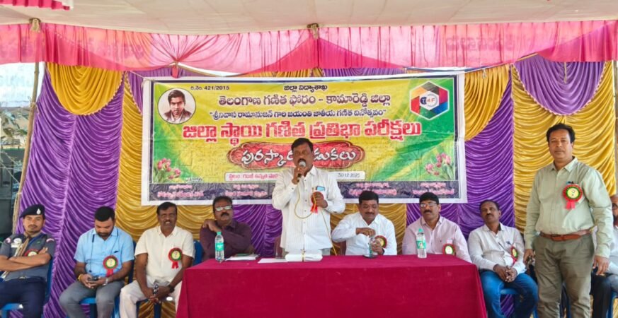 పున్నమి ప్రతినిధి కామారెడ్డి – 29 డిసెంబర్ 2025* *కామారెడ్డిలో ఘనంగా గణిత ప్రతిభా పురస్కారాల ప్రధానం* ==================================== కామారెడ్డి జిల్లా స్థాయిలో గణిత ఫోరం ఆధ్వర్యంలో జిల్లా అధ్యక్షులు వేణుగోపాల అధ్యక్షతన, ప్రధానోపాధ్యాయుల సంఘం అధ్యక్షులు నీలం లింగం గారి పర్యవేక్షణలో స్థానిక గంజ్ హైస్కూలు నందు గణిత ప్రతిభా ఫోటీ పరీక్షల కార్యక్రమం ఏర్పాటు చేయగా అందులో 225 మంది విద్యార్థులకు నిర్వహించడం జరిగింది. డీ.ఈ.వో రాజు గారు మాట్లాడుతూ మనిషి జీవితంలో గణితం లేకపోతే మనకు మనుగడే లేదన్నారు. విద్యార్థులకు గణితమంటే చాలా భయం ఉంటదని ఆ అపోహలను గణిత ఉపాధ్యాయులు తొలగించే ప్రయత్నం చేయాలన్నారు. విద్యార్థులు గణితం పై ప్రత్యేక శ్రద్ధ పెట్టాలని సూచించారు. జిల్లా స్థాయి గణిత ఫోరం ప్రతిభా పోటీల విజేతలు *తెలుగు మీడియంలో* ప్రథమ స్డానంలో బి.రాంచరణ్ – బోర్లం హైస్కూలు ద్వితీయ స్థానంలో జే.శ్రీకాంత్ – బుడ్మి హైస్కూలు తృతీయ స్థానంలో యం.గీత హంగర్గా హైస్కూలు *ఇంగ్లీషు మీడియం విభాగంలో* ప్రథమ స్డానంలో కే.సాయి వర్షిణి చుక్కాపూర్ హైస్కూలు ద్వితీయ స్థానంలో కే.విష్ణు ప్రియ – మాచారెడ్డి హైస్కూలు తృతీయ స్థానంలో జి మ.ప్రదీప్ – చుక్కాపూర్ హైస్కూలు *ఉర్దూ మీడియంలో* ప్రథమ స్డానంలో షేక్ మారిన్ గవర్నమెంట్ హైస్కూలు అడ్లూర్ ద్వితీయ స్థానంలో ఫాతిమా గవర్నమెంట్ హైస్కూలు అడ్లూర్ తృతీయ స్థానంలో బుష్రానాజ్ గల్స్ హైస్కూలు కామారెడ్డి *మోడల్ స్కూల్ & రెసిడెన్షియల్ స్కూల్స్* విభాగంలో ప్రథమ స్డానంలో జి.లక్ష్మణ్ మహాత్మా జ్యోతి బాపులే రెసిడెన్షియల్ స్కూల్ ఎర్రాపహడ్ ద్వితీయ స్థానంలో యస్.మానస సోషల్ వెల్ఫేర్ గల్స్ స్కూల్ దోమకొండ తృతీయ స్థానంలో కే శ్రీజ మాడల్ స్కూల్ ఎల్లారెడ్డి. పోటీలలో ప్రతిభ కనపరచి విజేతలైన విద్యార్థులకు ప్రతిభా పురస్కారాలను జిల్లా విద్యా శాఖాధికారి శ్రీ రాజు గారి చేతుల మీదిగా అందించడం జరిగింది. అనంతరం ఇటీవల గెజిటెడ్ ప్రధానోపాధ్యాయులుగా పదవి పొందిన ఈ.నివేదిత గారికి, అశోక్ గారికి, బసంత్ రాజ్ గారికి సన్మానం చేశారు. ఈ కార్యక్రమంలో సాంస్కృతిక కార్యక్రమాలు చేయించిన రాజేంద్ర గారికి, స్కౌట్ మాస్టర్ గారికి, రాధాదేవి మేడంకు మొ,, వారికి సన్మానం చేశారు. ఇట్టి కార్యక్రమంలో గణిత ఫోరం రాష్ట్ర అసోసియేషన్ అధ్యక్షులు తాడ్వాయి శ్రీనివాస్ గారు, జిల్లా సైన్స్ అధికారి సిద్దారాం రెడ్డి గారు, ఫిజికల్ సైన్స్ ఫోరం ప్రతాప్ రెడ్డి గారు, నరేందర్, లక్ష్మణ్, మంజుల, మరియు జిల్లాలోని గణిత ఉపాధ్యాయులు, తల్లి తండ్రులు, విధ్యార్థులు పాల్గొన్నారు