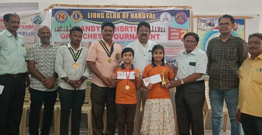 నంద్యాల జిల్లా చెస్ సంఘం, నంద్యాల లయన్స్ క్లబ్ సంయుక్త నిర్వహణలో ఈపూరి శేషయ్య శెట్టి ప్రభుత్వ పాలిటెక్నిక్ కళాశాల జింకా ఆడిటోరియంలో జరిగిన జిల్లా స్థాయి ఓపెన్ చదరంగం పోటీలలో విజేతలకు నంద్యాల లయన్స్ క్లబ్ వ్యవస్థాపక సభ్యులు, పారిశ్రామికవేత్త ఆత్మకూరు సుదర్శనం శెట్టి సౌజన్యంతో పతకాలు, ట్రోఫీలు, నగదు బహుమతులు అందజేయడం జరిగింది నంద్యాల జిల్లా చెస్ సంఘం ప్రధాన కార్యదర్శి రామసుబ్బారెడ్డి నిర్వహించిన బహుమతి ప్రధానోత్సవం లో నంద్యాల జిల్లా చెస్ సంఘం అధ్యక్షులు డాక్టర్ రవి కృష్ణ, ప్రముఖ వైద్యులు డాక్టర్ గెలివి సహదేవుడు, నంద్యాల లయన్స్ క్లబ్ అధ్యక్షులు సోమేసుల నాగరాజు కోశాధికారి అమిదేల జనార్ధన్ అతిథులుగా పాల్గొని మొదటి పది స్థానాలు సాధించిన వారికి ట్రోఫీలు,నగదు బహుమతులు,వివిధ వయసు కేటగిరీలలో విజేతలకు పతకాలు అందజేశారు ఈ సందర్భంగా డాక్టర్ రవి కృష్ణ, డాక్టర్ సహదేవుడు మాట్లాడుతూ గెలిచినవారు తమ గెలుపు స్థానాన్ని నిలబెట్టుకోవడానికి,విజయం అందుకోని వారు తదుపరి పోటీలలో విజయాలు సాధించడానికి కోచ్ ల పర్యవేక్షణలో నిత్య సాధన ద్వారా క్రీడలలో ఉన్నత స్థాయికి చేరుకోవచ్చని అన్నారు. ఆ విధమైన అంకితభావం,క్రమశిక్షణ క్రీడాకారులకు చాలా అవసరం అన్నారు ఈ కార్యక్రమంలో చెస్ జిల్లా సంఘం ప్రధాన కార్యదర్శి రామసుబ్బారెడ్డి, లయన్స్ క్లబ్ సభ్యులు మేడం చంద్రశేఖర్,టోర్నమెంట్ పర్యవేక్షకులు వెంకటరావు, గెలివి శ్రీకాంత్, సత్య సాయి పబ్లిక్ స్కూల్ కరస్పాండెంట్ మణికంఠ,నేషనల్ ఆర్బిటర్ సుజాత,వ్యాయామ ఉపాధ్యాయులు మాలిక్ భాషా, జస్ట్ కోచ్ శ్రీనివాసులు బహుమతి ప్రధానోత్సవం లో పాల్గొన్నారు నంద్యాల జిల్లా చదరంగం పోటీ విజేతలు: ఇమామ్ హుసేని ప్రధమ స్థానం,యుగంధర్ ద్వితీయ స్థానం, రిషితా బాయ్ తృతీయ స్థానం సాధించగా, తదుపరి ఆరు స్థానాలు మన్విత్ నాయక్,జానకి రామ రాజు,మోక్షిత్ కుమార్,సాయి కార్తికేయ,శాలెం మణికుమార్,లక్ష్మీ సందీప్,హార్జిత్ వర్మ సాధించి ట్రోఫీలు నగదు బహుమతులు అందుకున్నారు.
