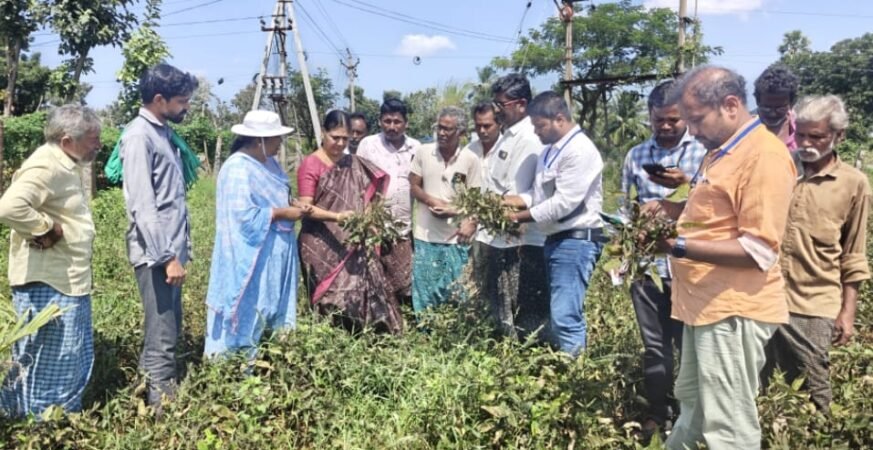 తుఫాను ప్రభావిత ప్రాంతాలలో క్షేత్ర పంటల నష్ట తీవ్రత మరియు నివారణ చర్యలపై వ్యవసాయ శాస్త్రవేత్తల సూచనలు…. తుఫాను ప్రభావంతో నష్టపోయిన తిరువూరు డివిజన్లోని కాకర్ల మరియు లక్ష్మీపురం గ్రామాలను అక్టోబర్ 31, 2025న వ్యవసాయ విశ్వవిద్యాలయ అధికారులు, కె.వి.కె. శాస్త్రవేత్తలు మరియు జిల్లా వ్యవసాయ అధికారులు సందర్శించారు. ఈ సందర్భంగా వారు రైతులను కలిసి, పంట నష్టం తీవ్రతను అంచనా వేసి, నివారణ చర్యలపై విలువైన సూచనలు చేశారు. వరి పంటలో తీసుకోవాల్సిన ముఖ్య జాగ్రత్తలు తుఫాను కారణంగా వర్షం తగ్గి ఎండ తీవ్రత పెరిగితే, ఎండాకు తెగులు, మానిపండు తెగులు, మాగుడు తెగులు, ఆకుముడత మరియు దోమపోటు వంటి తెగుళ్లు పెరిగే అవకాశం ఉందని శాస్త్రవేత్తలు హెచ్చరించారు. నీటి తొలగింపు: పొలంలో నిలిచిన నీటిని అంతర్గత కాలువల ద్వారా వెంటనే తొలగించాలి. తెగుళ్ల నివారణ (రంగు మారడం, మాగుడు, మానిపండు): నిలబడి ఉన్న లేదా పడిపోయిన వరి చేలలో గింజలు రంగు మారడం, మాగుడు తెగులు మరియు మానిపండు తెగులు వ్యాప్తిని నివారించడానికి, ఎకరాకు 200 మి.లీ. ప్రొపికోనాజోల్ పిచికారీ చేయాలి. మొలకెత్తడాన్ని తగ్గించడానికి: కోత దశలో నిలిచిన లేదా పడిపోయిన పంటలో కంకిలో మొలకలు కనిపిస్తే, నీటిని తొలగించిన తర్వాత, 5% ఉప్పు ద్రావణం (50 గ్రాములు కల్లు ఉప్పు / లీటరు నీటికి) కలిపి పిచికారీ చేయాలి. ఇది మొలకెత్తడాన్ని మరియు రంగు మారడాన్ని తగ్గిస్తుంది. 🌿 ప్రత్తి పంటలో తీసుకోవలసిన జాగ్రత్తలు అదనపు నీటి తొలగింపు: ప్రత్తి పంట నుండి నిలబడి ఉన్న అదనపు నీటిని వెంటనే బయటకు తీసివేయాలి. పోషకాల నిర్వహణ: ఎండగా ఉన్న సమయంలో 1-2% పొటాషియం నైట్రేట్ లేదా 19:19:19 ద్రావణాన్ని వారం రోజుల వ్యవధిలో రెండుసార్లు పిచికారీ చేయాలి. కాయ తెగులు నివారణ (ముందు జాగ్రత్త): 90 రోజుల పంటలో కాయ తెగులును నివారించడానికి ముందు జాగ్రత్త చర్యగా కాపర్ ఆక్సీక్లోరైడ్ (COC) 600 గ్రా/ఎకరానికి పిచికారీ చేయాలి. మచ్చ తెగుళ్ళ నివారణ: ఆకుల మీద వచ్చే మచ్చ తెగుళ్ళను నివారించడానికి కార్బెండజిమ్ + మాంకోజెబ్ మిశ్రమాన్ని 2.5 గ్రా/లీ చొప్పున పిచికారీ చేయాలి. సూచన: ఈ వాతావరణంలో ఆశించే తెగుళ్ళను డ్రోన్లను ఉపయోగించడం ద్వారా తక్కువ సమయంలో ఎక్కువ విస్తీర్ణంలో పిచికారీ చేసుకుని కొంతవరకు పంటను కాపాడుకోవలసిందిగా అధికారులు రైతులకు సూచించారు. ఈ క్షేత్ర సందర్శనలో డాక్టర్ ఏ. మనీ డిన్ (వ్యవసాయ ఇంజనీరింగ్, లాం, ఆంగ్రూ), డి.ఎం.ఎఫ్ విజయ కుమారి (వ్యవసాయ జిల్లా అధికారి), డాక్టర్ ఎం. రవి కిషోర్ (ప్రోగ్రాం కోఆర్డినేటర్), డాక్టర్ పి.యన్ శివ ప్రసాద్, డాక్టర్ ఎన్ రాజశేఖర్, శ్రీమతి పద్మ (తిరువూరు ఏవో) మరియు వి.ఏ.ఏ.లు పాల్గొన్నారు.