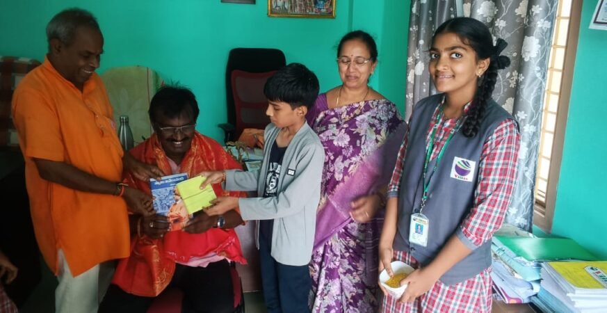 అమలాపురం; స్థానిక విద్యానిధి స్కూల్లో వివేకానంద సేవా సమితి సభ్యులు గనిశెట్టి వెంకటేశ్వరరావు గారి అబ్బాయి నరేంద్ర పుట్టినరోజు సందర్భంగా విద్యాసంస్థల చైర్మన్ A.B. నాయుడు గారికి, కాలేజ్ ప్రిన్సిపల్ సుధీర్ బాబు గారికి , స్కూల్ ప్రిన్సిపల్ మాధవి గారికి , టీచర్స్ అందరికీ మరియు పని సిబ్బందికి శాలువాతో సత్కారం చేసి వివేకానందుని జీవితం సందేశం అనే పుస్తకాన్ని అందించి దానితోపాటు ఖాదీ జేబురుమాలను అందించారు. ఈ సందర్భంగా చైర్మన్ నాయుడు గారు మాట్లాడుతూ ప్రస్తుత సమాజంలో విద్యార్థులకు టీచర్స్ పై గౌరవం పెంచే ఆవశ్యకత ఎంతైనా ఉందని ఇలాంటి మంచి కార్యక్రమం చేసిన బాబీ మాస్టర్ ని కొనియాడారు. ప్రిన్సిపల్ మాధవి గారు మాట్లాడుతూ మాకంటే సంస్థకి ఎంతో అవసరమైన పని సిబ్బందికి సన్మానం చేయడం నాకు ఎంతో ఆనందం కలిగించిందని నరేంద్ర ని ఆశీర్వదించారు.
